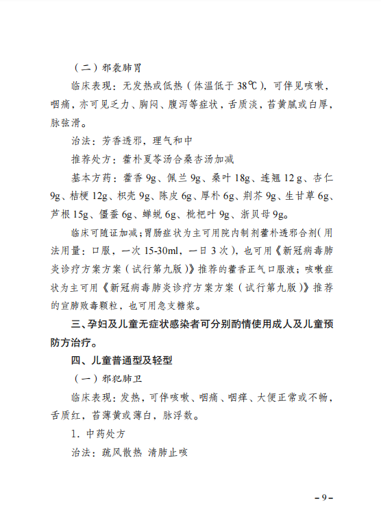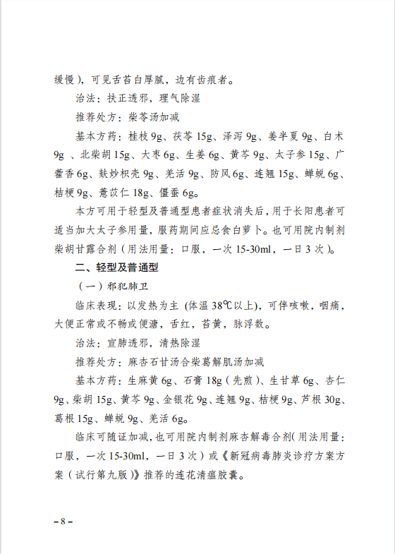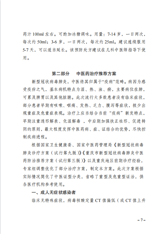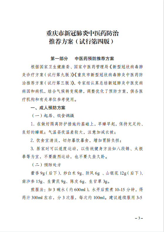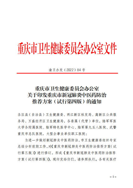 重庆市卫生健康委员会办公室关于印发重庆市新冠肺炎中医药防治推荐方案(试行第四版)的通知