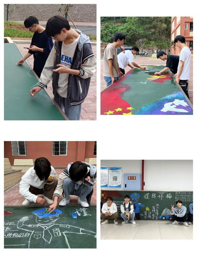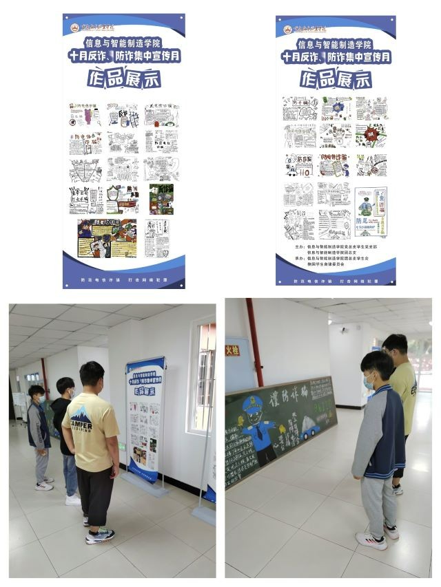 10月6日,在楠园制作绘画“谨防反诈”黑板报,用笔以线抵御诈骗信息,用五彩颜料勾勒网络安全。同时,将优秀的反诈宣传画以展架的方式,融入于同学们的生活点滴之中,时刻不忘反诈意识,片刻不离反诈宣传。